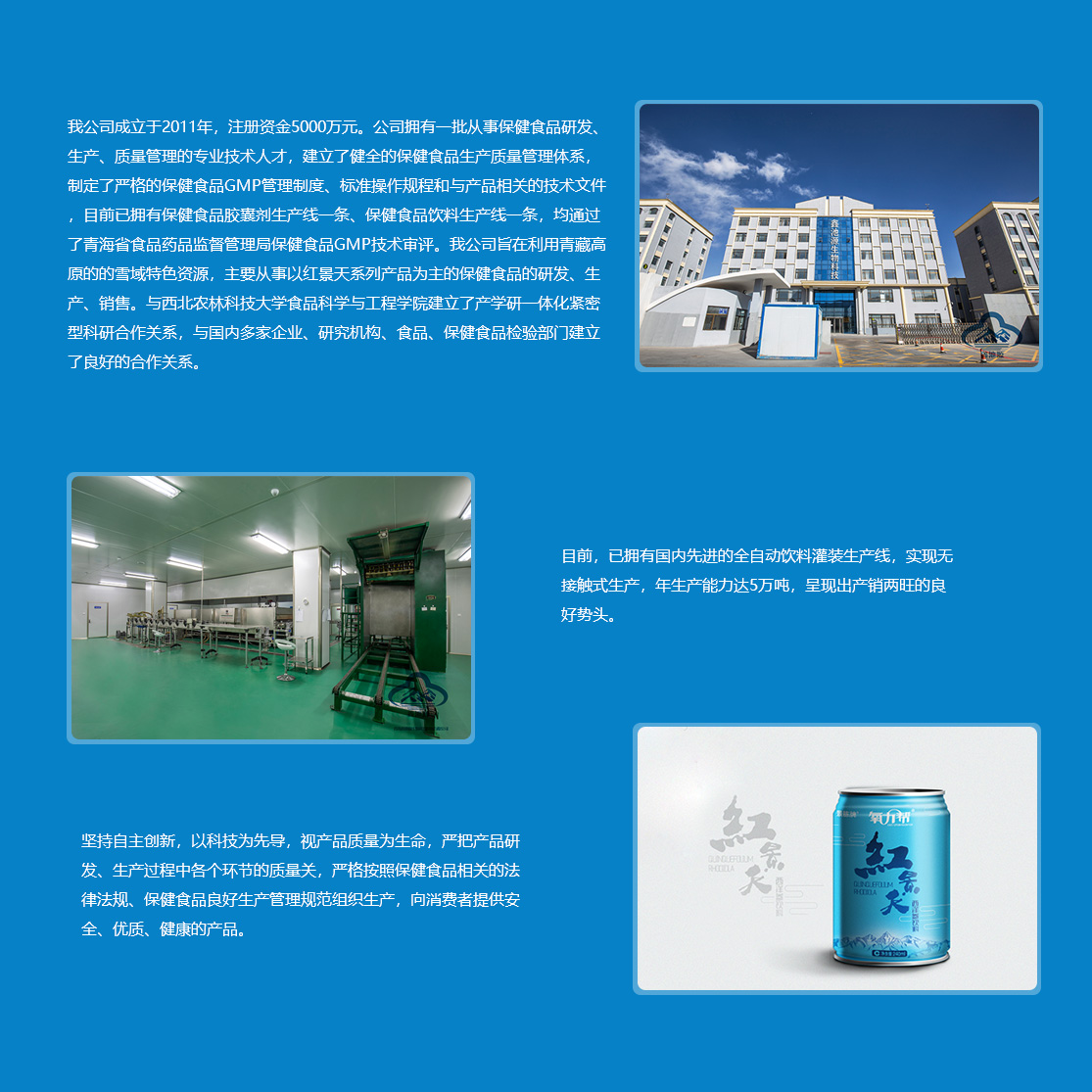 青海鑫池源生物科技開(kāi)發(fā)有限公司2011年3月29日在青海生物科技產(chǎn)業(yè)園區(qū)工商行政管理分局登記成立,注冊(cè)資金5000萬(wàn)元。         鑫池源公司立足于青海省綠色環(huán)保無(wú)污染的高品質(zhì)紅景天資源,以西北農(nóng)林科技大學(xué)食品科學(xué)與工程學(xué)院和青海格拉丹東藥業(yè)有限公司為技術(shù)依托,主要從事紅景天、紅枸杞、黑枸杞等高原生態(tài)植物資源的研究開(kāi)發(fā)和深加工,產(chǎn)品包括“景胨”牌紅景天西洋參保健飲品、紅景天口服液、紅景天膠囊等系列產(chǎn)品。         公司擁有一批從事保健食品研發(fā)、生產(chǎn)、質(zhì)量管理的專業(yè)技術(shù)人才,建立了健全的保健食品生產(chǎn)質(zhì)量管理體系,制定了嚴(yán)格的保健食品GMP管理制度、標(biāo)準(zhǔn)操作規(guī)程和與產(chǎn)品相關(guān)的技術(shù)文件,目前已擁有保健食品膠囊劑生...